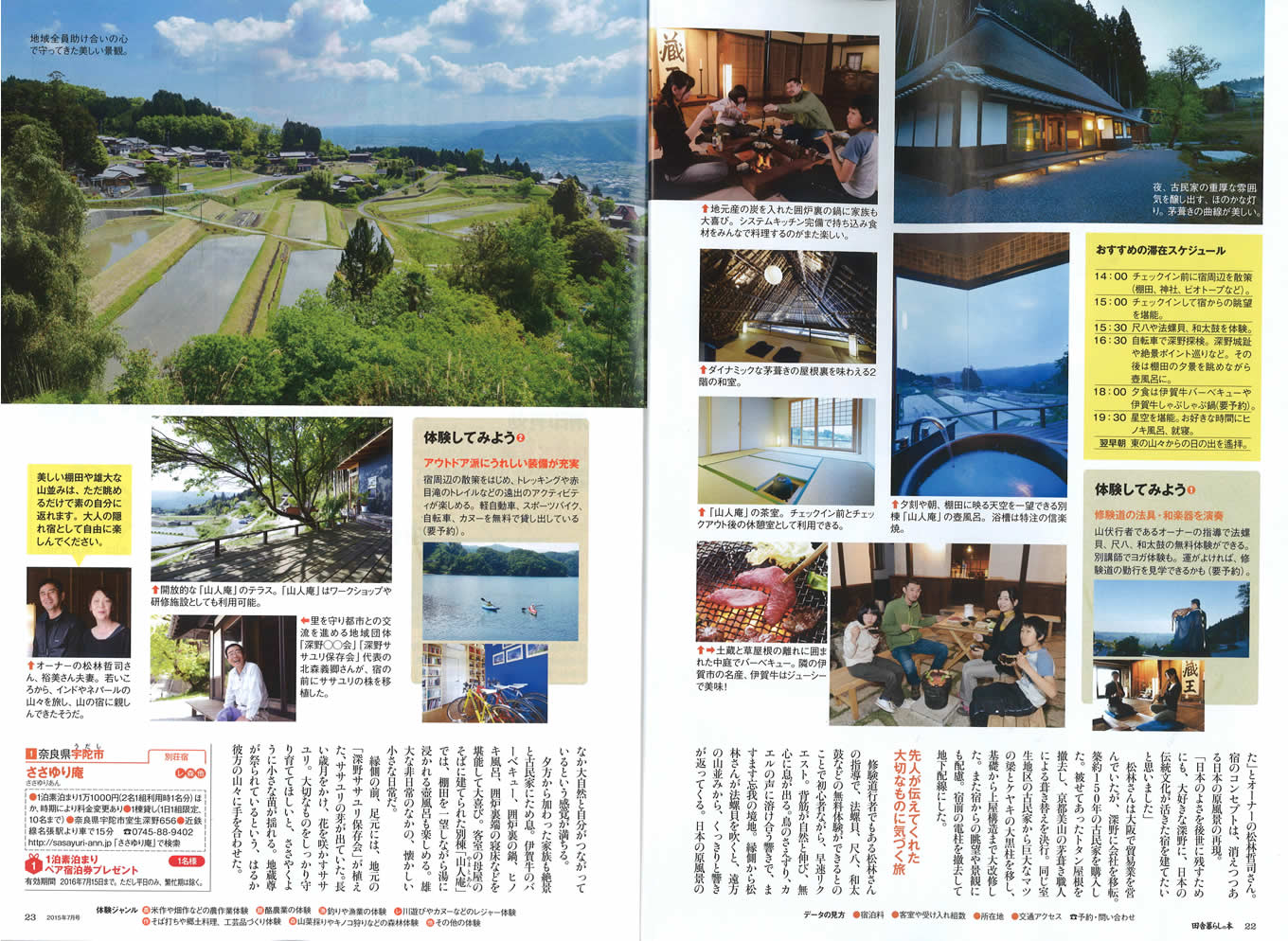 ” 特集「田舎体験の宿90」のトップページを4ページで一番最初を飾りました。ありがたいですね。「田舎暮らしの本」は結構、自然派の人達の間ではよく読まれている本なので、その編集部がトップに取り上げてくださったことに、大変大きな意味合いと誇るべき内容があると感じますね。そのような栄誉にこたえられる宿に更なる努力をしたいと思います。皆さんのお越しをお待ちしています。副題「あたらしい泊り方BOOK」で紹介されました。